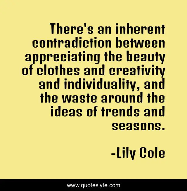 This page presents the quote "There's an inherent contradiction between appreciating the beauty of clothes and creativity and individuality, and the waste around the ideas of trends and seasons.". Author of this quote is Lily Cole. This quote is about seasons, creativity, ideas,.