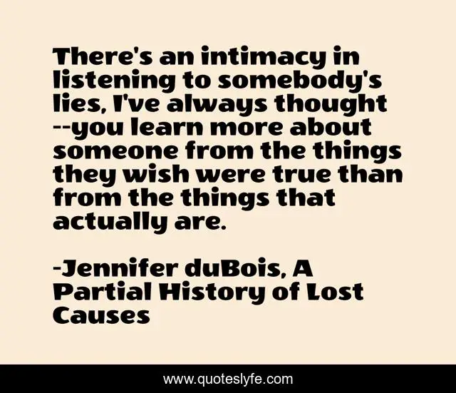 "Jennifer duBois, A Partial History of Lost Causes Quotes." Quoteslyfe.com, 2025. Fri. 05 Dec. 2025. <https://www.quoteslyfe.com/quote/There-s-an-intimacy-in-listening-to-167756>.