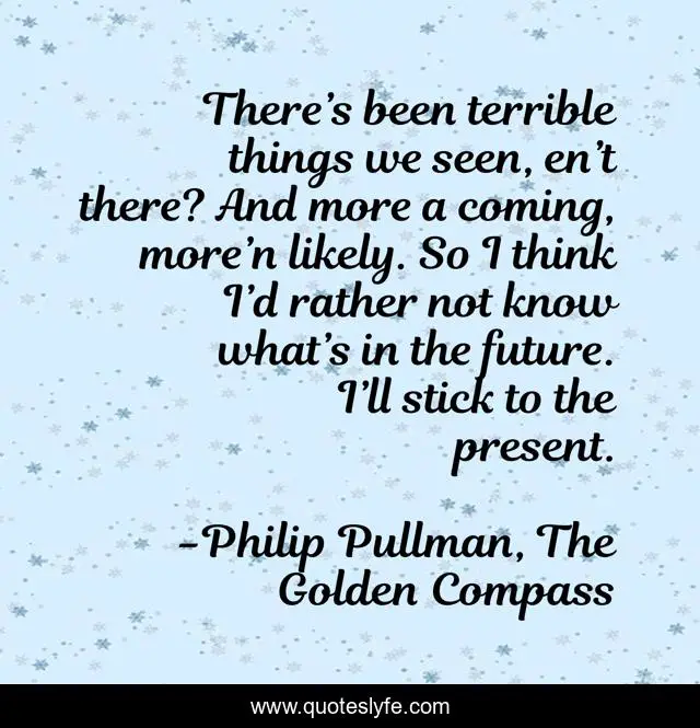 This page presents the quote "There’s been terrible things we seen, en’t there? And more a coming, more’n likely. So I think I’d rather not know what’s in the future. I’ll stick to the present.". Author of this quote is Philip Pullman, The Golden Compass. This quote is about future, philosophy, present, child,.