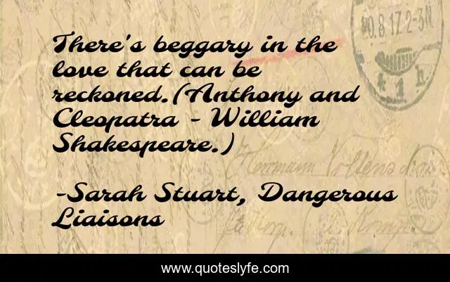 This page presents the quote "There's beggary in the love that can be reckoned.(Anthony and Cleopatra - William Shakespeare.)". Author of this quote is Sarah Stuart, Dangerous Liaisons. .