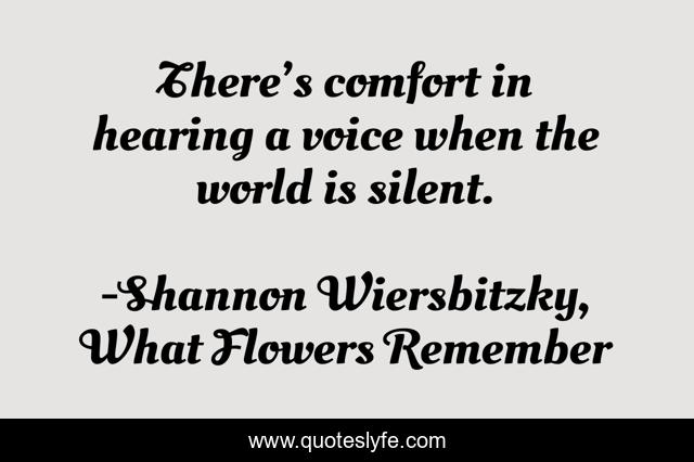 This page presents the quote "There’s comfort in hearing a voice when the world is silent.". Author of this quote is Shannon Wiersbitzky, What Flowers Remember. This quote is about alone, voice, silence, voices,.