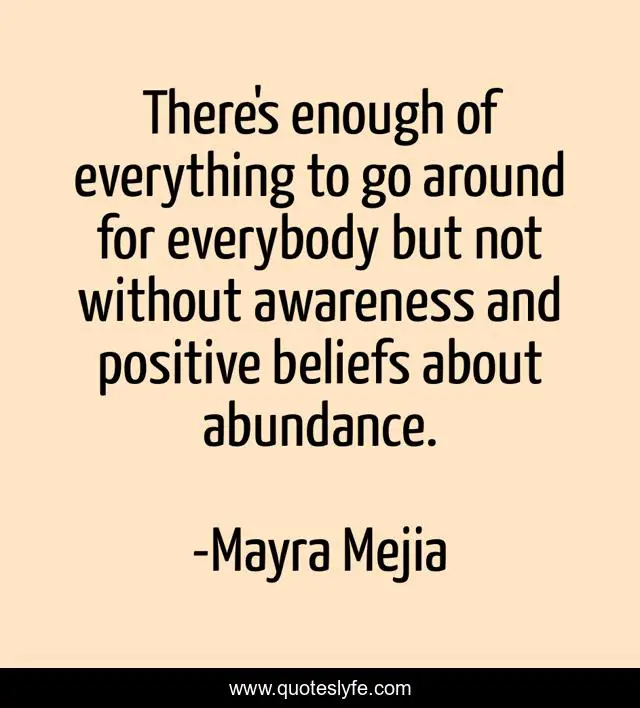 This page presents the quote "There's enough of everything to go around for everybody but not without awareness and positive beliefs about abundance.". Author of this quote is Mayra Mejia. This quote is about self-motivation, self-improvement, self-help,.
