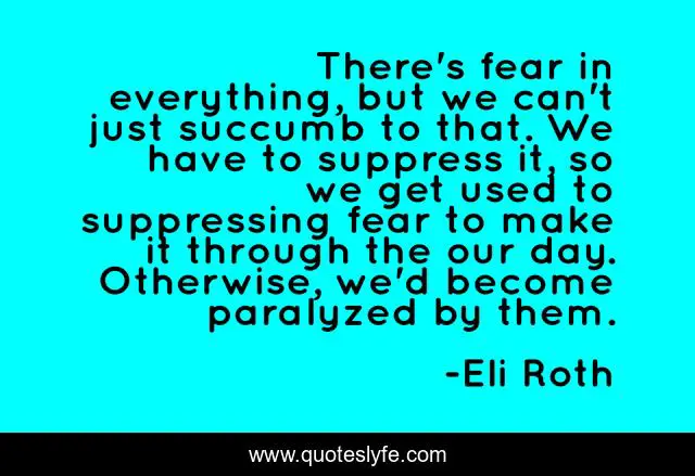 This page presents the quote "There's fear in everything, but we can't just succumb to that. We have to suppress it, so we get used to suppressing fear to make it through the our day. Otherwise, we'd become paralyzed by them.". Author of this quote is Eli Roth. This quote is about everything, through, day,.