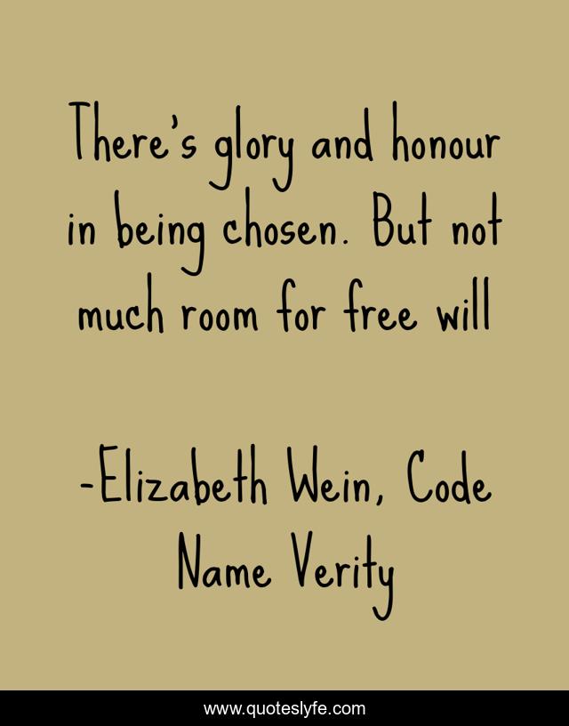 This page presents the quote "There’s glory and honour in being chosen. But not much room for free will". Author of this quote is Elizabeth Wein, Code Name Verity. This quote is about chosen, freedom, freedom-of-choice, code-name-verity,.