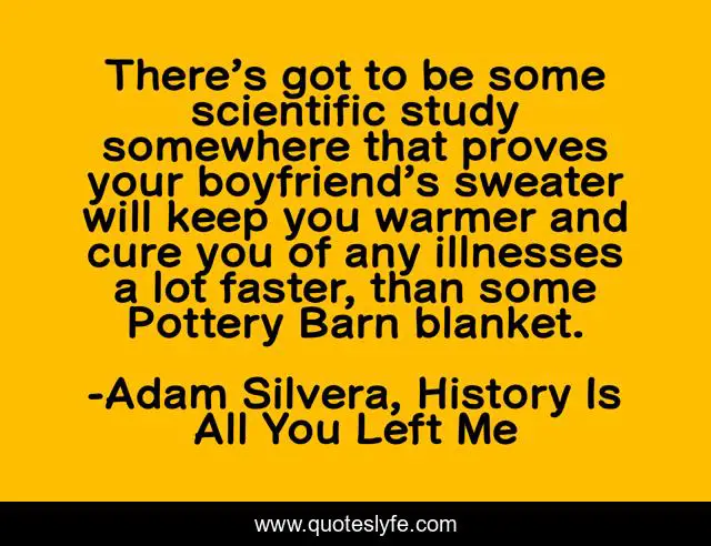 This page presents the quote "There’s got to be some scientific study somewhere that proves your boyfriend’s sweater will keep you warmer and cure you of any illnesses a lot faster, than some Pottery Barn blanket.". Author of this quote is Adam Silvera, History Is All You Left Me. .