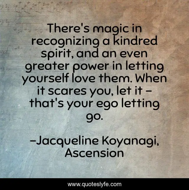 This page presents the quote "There's magic in recognizing a kindred spirit, and an even greater power in letting yourself love them. When it scares you, let it - that's your ego letting go.". Author of this quote is Jacqueline Koyanagi, Ascension. This quote is about kindred-spirits, magic, romance, friendship-and-love, love, fear, affection,.