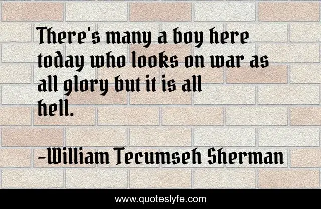This page presents the quote "There's many a boy here today who looks on war as all glory but it is all hell.". Author of this quote is William Tecumseh Sherman. This quote is about hell, today, glory,.