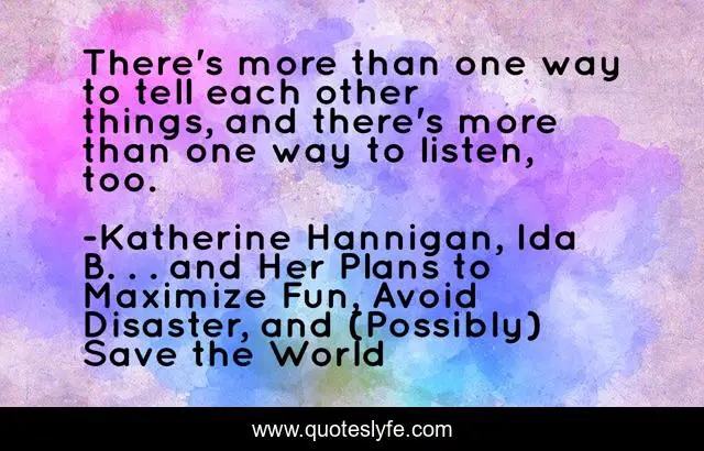 This page presents the quote "There's more than one way to tell each other things, and there's more than one way to listen, too.". Author of this quote is Katherine Hannigan, Ida B. . . and Her Plans to Maximize Fun, Avoid Disaster, and (Possibly) Save the World. .