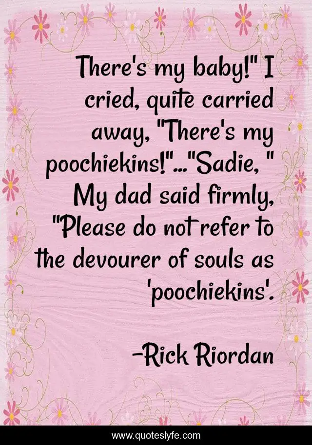 This page presents the quote "There's my baby!" I cried, quite carried away, "There's my poochiekins!"..."Sadie, " My dad said firmly, "Please do not refer to the devourer of souls as 'poochiekins'.". Author of this quote is Rick Riordan. This quote is about ancient-egypt, children-s, humor, mythology, serpent-in-the-shadows,.