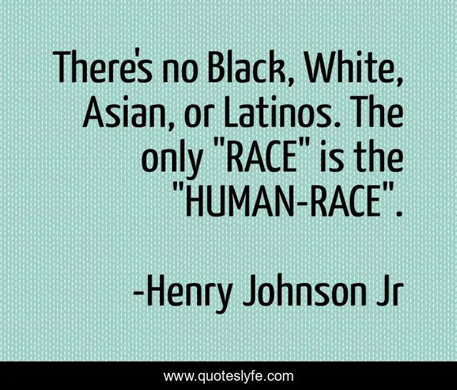 This page presents the quote "There's no Black, White, Asian, or Latinos. The only "RACE" is the "HUMAN-RACE".". Author of this quote is Henry Johnson Jr. This quote is about human-race, martin-luther-king-jr, quotes-to-live-by,.