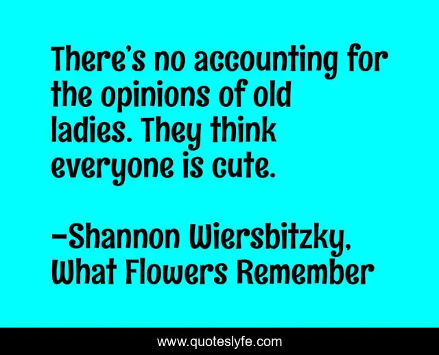This page presents the quote "There’s no accounting for the opinions of old ladies. They think everyone is cute.". Author of this quote is Shannon Wiersbitzky, What Flowers Remember. This quote is about cute, old-people, humor, old-ladies,.