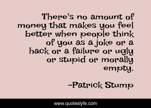 This page presents the quote "There's no amount of money that makes you feel better when people think of you as a joke or a hack or a failure or ugly or stupid or morally empty.". Author of this quote is Patrick Stump. This quote is about money, stupid, people,.