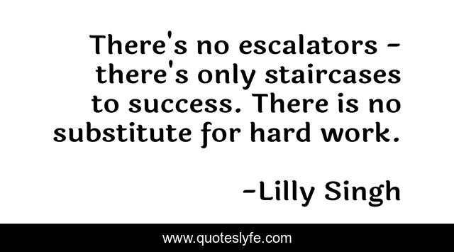 This page presents the quote "There's no escalators - there's only staircases to success. There is no substitute for hard work.". Author of this quote is Lilly Singh. This quote is about hard, success, hard work,.