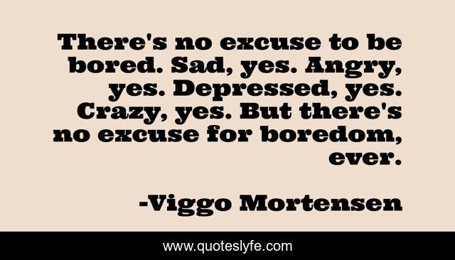 This page presents the quote "There's no excuse to be bored. Sad, yes. Angry, yes. Depressed, yes. Crazy, yes. But there's no excuse for boredom, ever.". Author of this quote is Viggo Mortensen. This quote is about crazy, angry, boredom,.