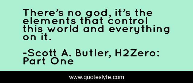 This page presents the quote "There’s no god, it’s the elements that control this world and everything on it.". Author of this quote is Scott A. Butler, H2Zero: Part One. This quote is about control, life, elements, post-apocalypse, dystopian, god, post-apocalyptic, gods, world,.