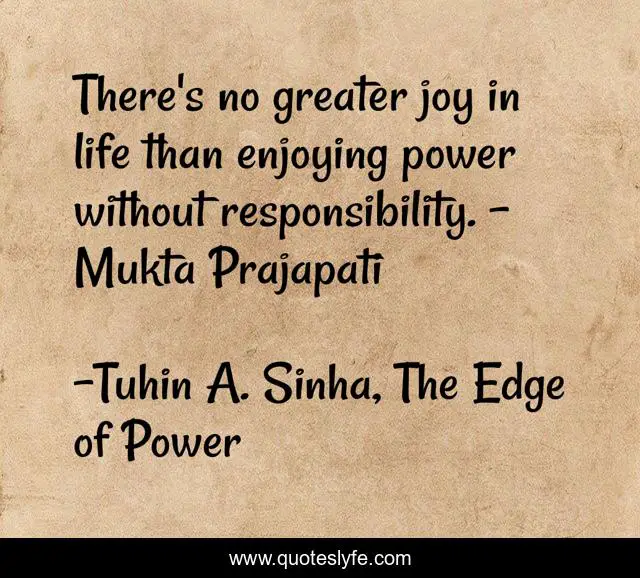 This page presents the quote "There's no greater joy in life than enjoying power without responsibility. - Mukta Prajapati". Author of this quote is Tuhin A. Sinha, The Edge of Power. This quote is about fiction-novel, india, politicsics,.