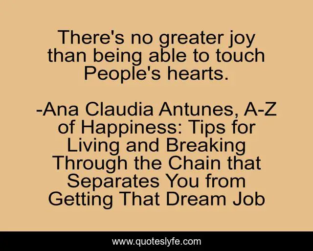"Ana Claudia Antunes, A-Z of Happiness: Tips for Living and Breaking Through the Chain that Separates You from Getting That Dream Job Quotes." Quoteslyfe.com, 2025. Fri. 05 Dec. 2025. <https://www.quoteslyfe.com/quote/There-s-no-greater-joy-than-being-17291>.