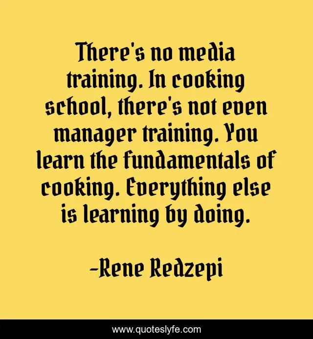 This page presents the quote "There's no media training. In cooking school, there's not even manager training. You learn the fundamentals of cooking. Everything else is learning by doing.". Author of this quote is Rene Redzepi. This quote is about school, cooking, training,.