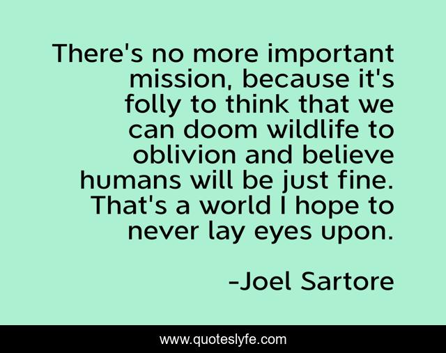 This page presents the quote "There's no more important mission, because it's folly to think that we can doom wildlife to oblivion and believe humans will be just fine. That's a world I hope to never lay eyes upon.". Author of this quote is Joel Sartore. .