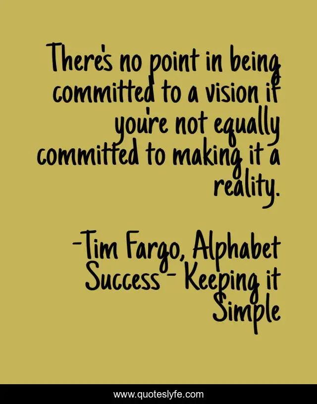 This page presents the quote "There's no point in being committed to a vision if you're not equally committed to making it a reality.". Author of this quote is Tim Fargo, Alphabet Success - Keeping it Simple. This quote is about goal, visionary, commitment, vision, commitment-and-attitude, goals, goal-setting,.