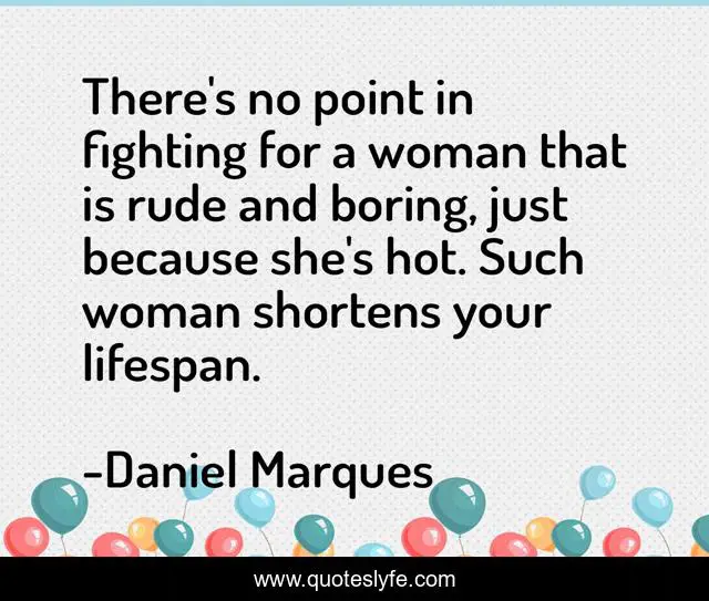 This page presents the quote "There's no point in fighting for a woman that is rude and boring, just because she's hot. Such woman shortens your lifespan.". Author of this quote is Daniel Marques. This quote is about narcissism, relationships, love, psychology, pua, codependency, affection,.