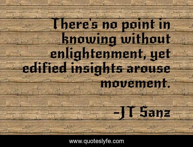 This page presents the quote "There's no point in knowing without enlightenment, yet edified insights arouse movement.". Author of this quote is JT Sanz. This quote is about knowledge-of-self, enlightenment, movements, knowledge, optimist,.