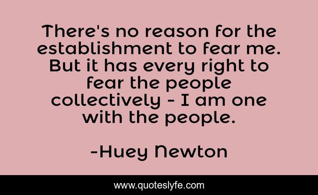 This page presents the quote "There's no reason for the establishment to fear me. But it has every right to fear the people collectively - I am one with the people.". Author of this quote is Huey Newton. This quote is about me, people,.