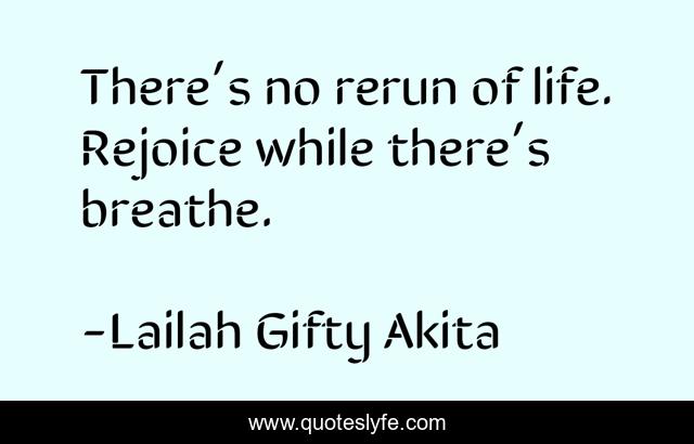 This page presents the quote "There’s no rerun of life. Rejoice while there’s breathe.". Author of this quote is Lailah Gifty Akita. This quote is about living, life, positive, motivational, wise-words, wisdom-of-lailah-gifty-akita, optimistic, confidence,.