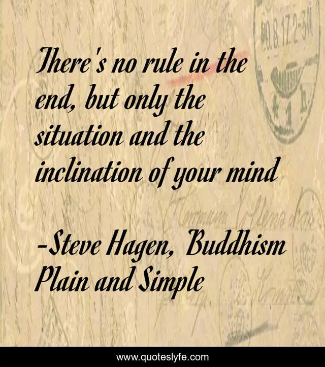 This page presents the quote "There's no rule in the end, but only the situation and the inclination of your mind". Author of this quote is Steve Hagen, Buddhism Plain and Simple. This quote is about zen, zen-buddhism,.