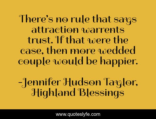 This page presents the quote "There's no rule that says attraction warrents trust. If that were the case, then more wedded couple would be happier.". Author of this quote is Jennifer Hudson Taylor, Highland Blessings. This quote is about attraction, trust, marriage,.
