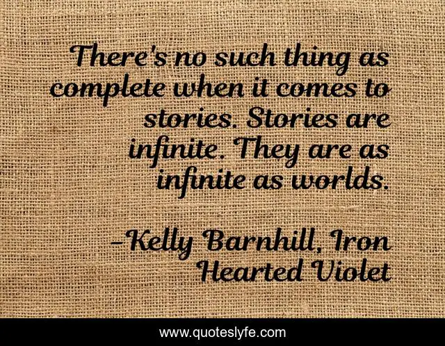 This page presents the quote "There's no such thing as complete when it comes to stories. Stories are infinite. They are as infinite as worlds.". Author of this quote is Kelly Barnhill, Iron Hearted Violet. This quote is about iron-hearted-violet, complete, kelly-barnhill, worlds, complex, stories, words, infinite, incomplete,.