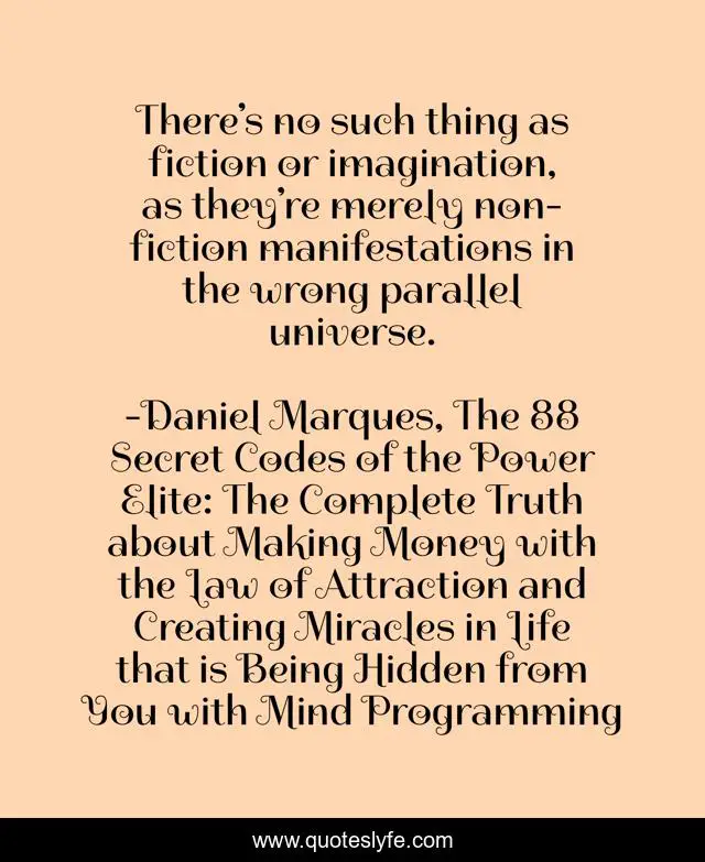 This page presents the quote "There’s no such thing as fiction or imagination, as they’re merely non-fiction manifestations in the wrong parallel universe.". Author of this quote is Daniel Marques, The 88 Secret Codes of the Power Elite: The Complete Truth about Making Money with the Law of Attraction and Creating Miracles in Life that is Being Hidden from You with Mind Programming. .