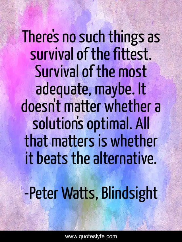 This page presents the quote "There's no such things as survival of the fittest. Survival of the most adequate, maybe. It doesn't matter whether a solution's optimal. All that matters is whether it beats the alternative.". Author of this quote is Peter Watts, Blindsight. This quote is about evolution, survival-of-the-fittest,.
