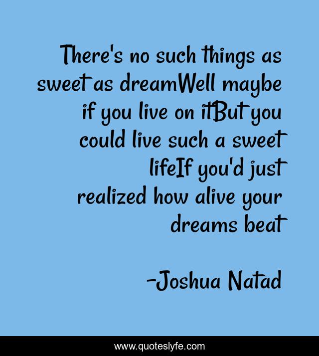 This page presents the quote "There's no such things as sweet as dreamWell maybe if you live on itBut you could live such a sweet lifeIf you'd just realized how alive your dreams beat". Author of this quote is Joshua Natad. This quote is about humorous, philosophical, satirical-humor, dream, visionary,.