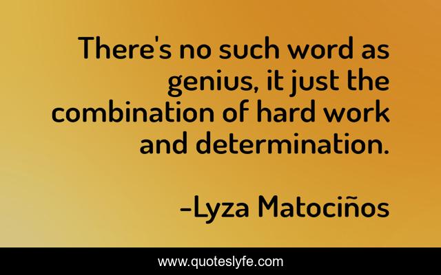 This page presents the quote "There's no such word as genius, it just the combination of hard work and determination.". Author of this quote is Lyza Matociños. This quote is about hardwork, genius, determination,.