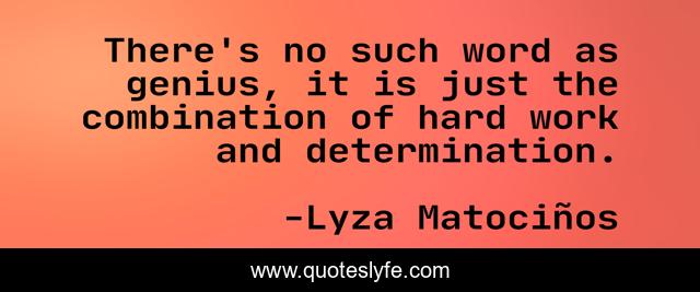 This page presents the quote "There's no such word as genius, it is just the combination of hard work and determination.". Author of this quote is Lyza Matociños. This quote is about hard-work, excel, genius, genius-children, determination, genius-thinkers,.