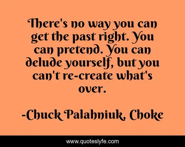 This page presents the quote "There's no way you can get the past right. You can pretend. You can delude yourself, but you can't re-create what's over.". Author of this quote is Chuck Palahniuk, Choke. .