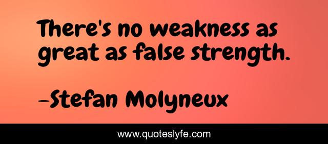 This page presents the quote "There's no weakness as great as false strength.". Author of this quote is Stefan Molyneux. This quote is about psychology, self-knowledge, abuse, childhood-trauma, trauma, therapy, false-self, self-esteem,.