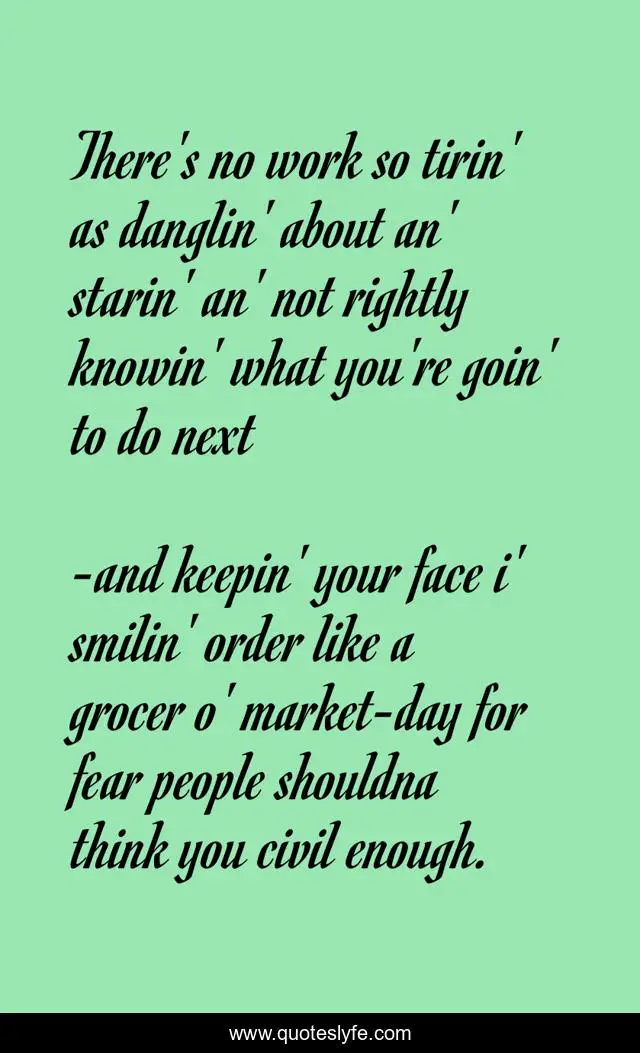 "and keepin' your face i' smilin' order like a grocer o' market-day for fear people shouldna think you civil enough. Quotes." Quoteslyfe.com, 2025. Sat. 06 Dec. 2025. <https://www.quoteslyfe.com/quote/There-s-no-work-so-tirin-as-196479>.