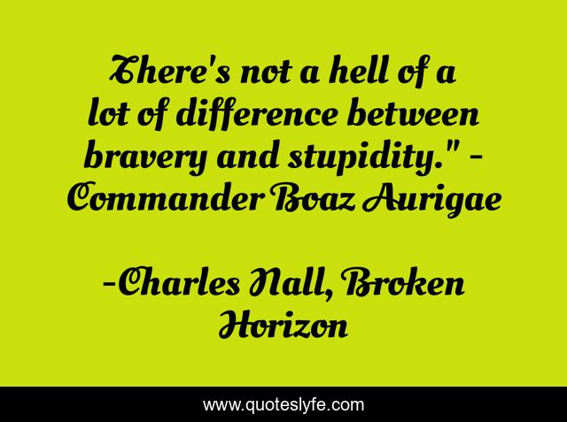 This page presents the quote "There's not a hell of a lot of difference between bravery and stupidity." - Commander Boaz Aurigae". Author of this quote is Charles Nall, Broken Horizon. This quote is about military-science-fiction, space-opera, science-fiction,.