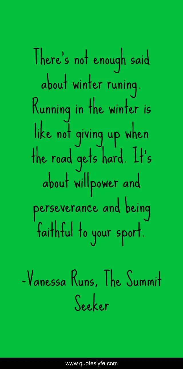 This page presents the quote "There's not enough said about winter runing. Running in the winter is like not giving up when the road gets hard. It's about willpower and perseverance and being faithful to your sport.". Author of this quote is Vanessa Runs, The Summit Seeker. This quote is about running, ultrarunning,.