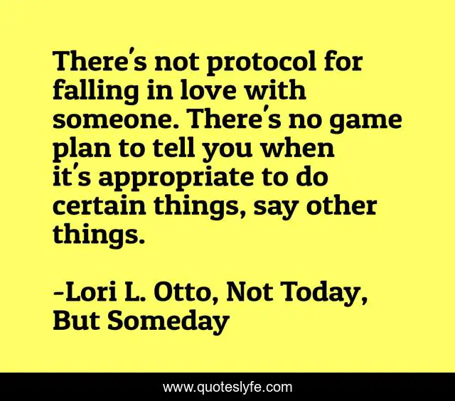 This page presents the quote "There's not protocol for falling in love with someone. There's no game plan to tell you when it's appropriate to do certain things, say other things.". Author of this quote is Lori L. Otto, Not Today, But Someday. This quote is about love, falling-in-love, protocol, affection,.