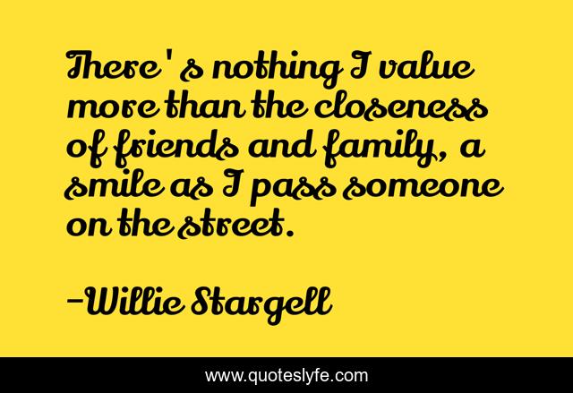 This page presents the quote "There's nothing I value more than the closeness of friends and family, a smile as I pass someone on the street.". Author of this quote is Willie Stargell. This quote is about smile, friends, value, happiness,.