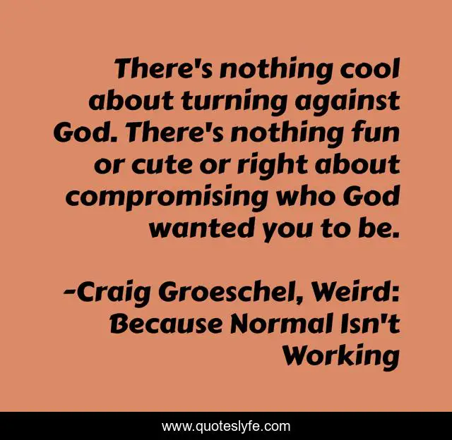 This page presents the quote "There's nothing cool about turning against God. There's nothing fun or cute or right about compromising who God wanted you to be.". Author of this quote is Craig Groeschel, Weird: Because Normal Isn't Working. This quote is about be, compromising, turning, wanted, cute, god, against, to, right,.
