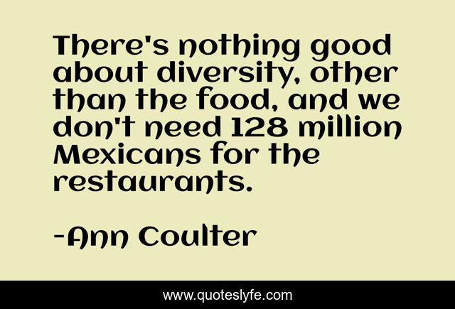 This page presents the quote "There's nothing good about diversity, other than the food, and we don't need 128 million Mexicans for the restaurants.". Author of this quote is Ann Coulter. This quote is about diversity, humor, immigration, conservative,.