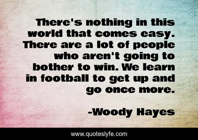 This page presents the quote "There's nothing in this world that comes easy. There are a lot of people who aren't going to bother to win. We learn in football to get up and go once more.". Author of this quote is Woody Hayes. .