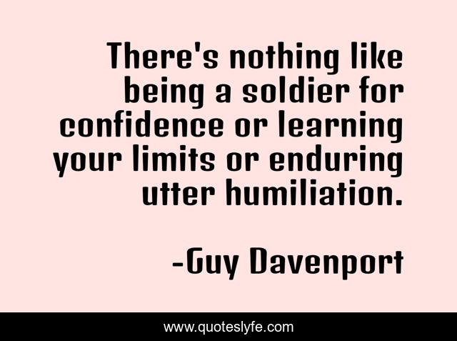 This page presents the quote "There's nothing like being a soldier for confidence or learning your limits or enduring utter humiliation.". Author of this quote is Guy Davenport. This quote is about soldier, confidence, limits,.