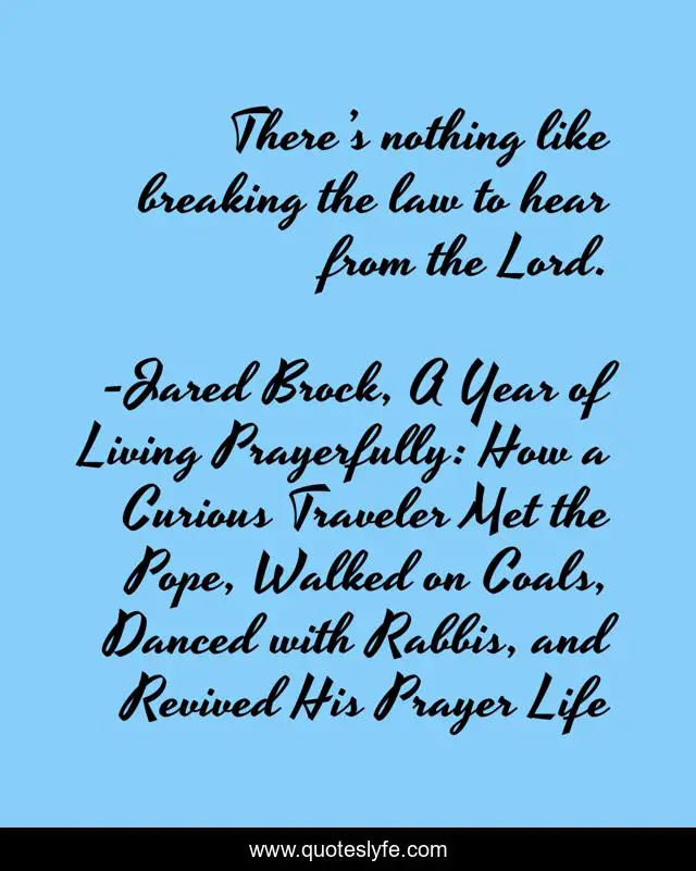 This page presents the quote "There’s nothing like breaking the law to hear from the Lord.". Author of this quote is Jared Brock, A Year of Living Prayerfully: How a Curious Traveler Met the Pope, Walked on Coals, Danced with Rabbis, and Revived His Prayer Life. This quote is about hear-from-god, prayer, break-the-law, god, lord, law,.