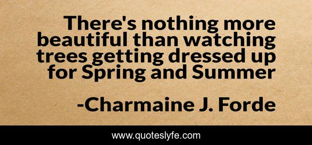 This page presents the quote "There's nothing more beautiful than watching trees getting dressed up for Spring and Summer". Author of this quote is Charmaine J. Forde. This quote is about beautiful, spring, trees, summer,.