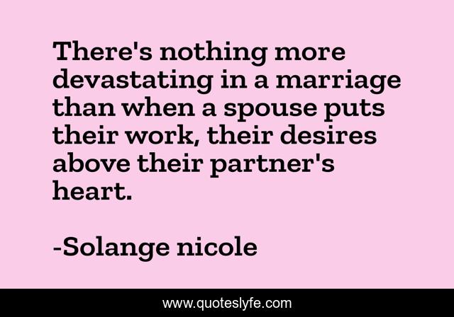 This page presents the quote "There's nothing more devastating in a marriage than when a spouse puts their work, their desires above their partner's heart.". Author of this quote is Solange nicole. This quote is about heart, life, love, divorce, bull-dozing, deprioritizing, marriage, affection,.